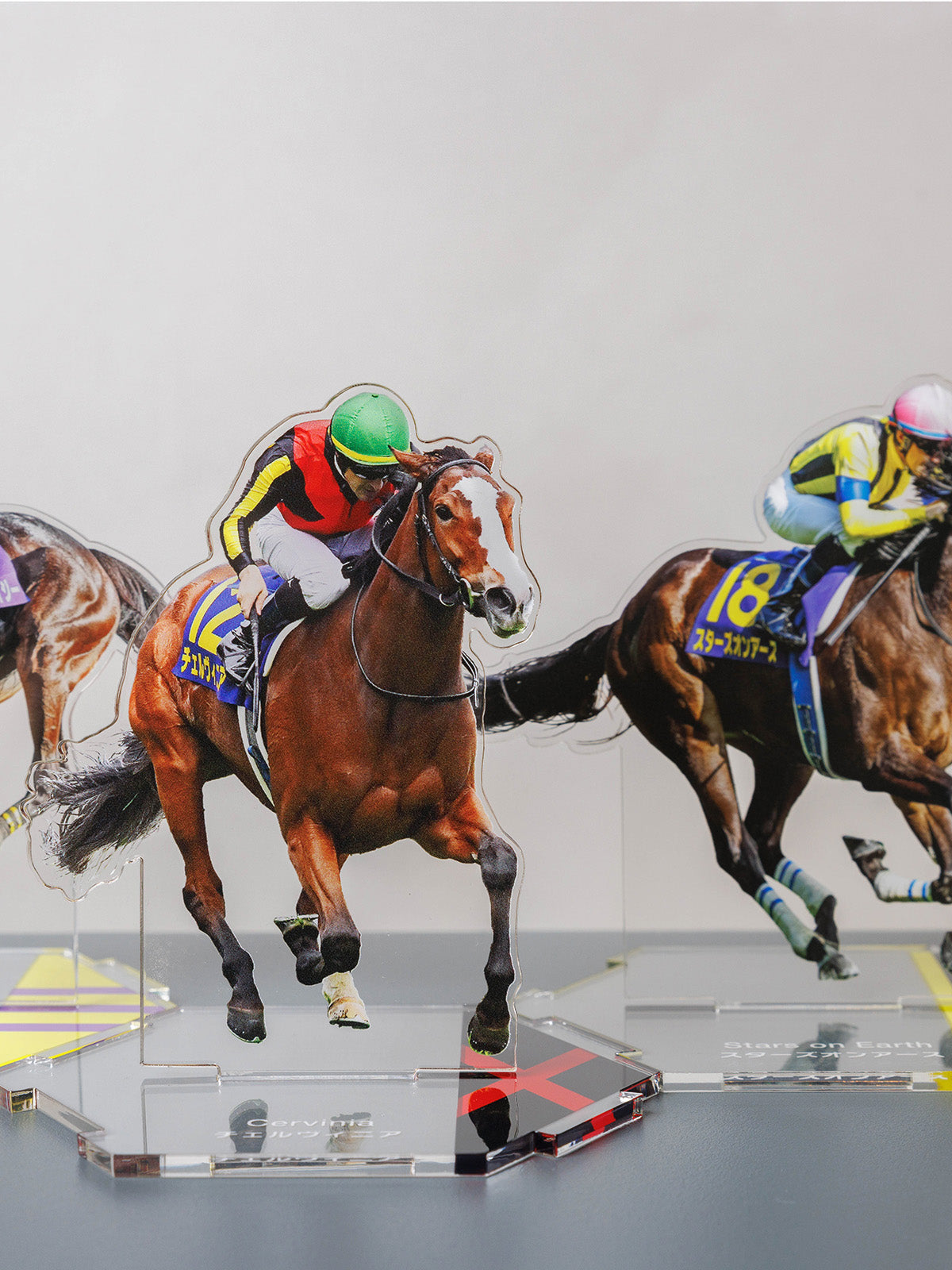 ご自宅や職場で飾っていただくのはもちろん、販売中・今後販売予定の名馬アクリルスタンドとつなげてお楽しみください。