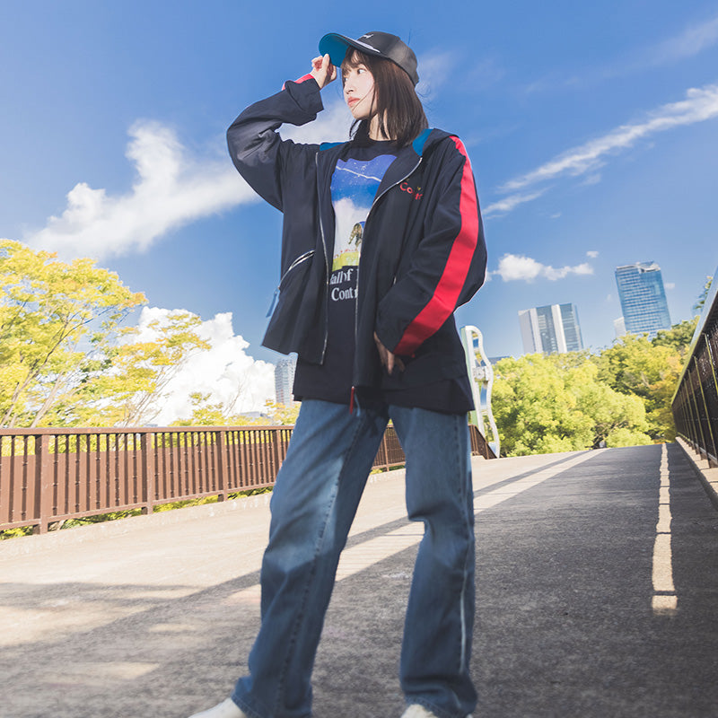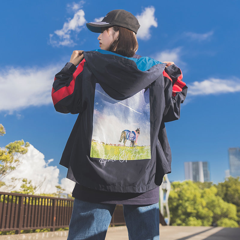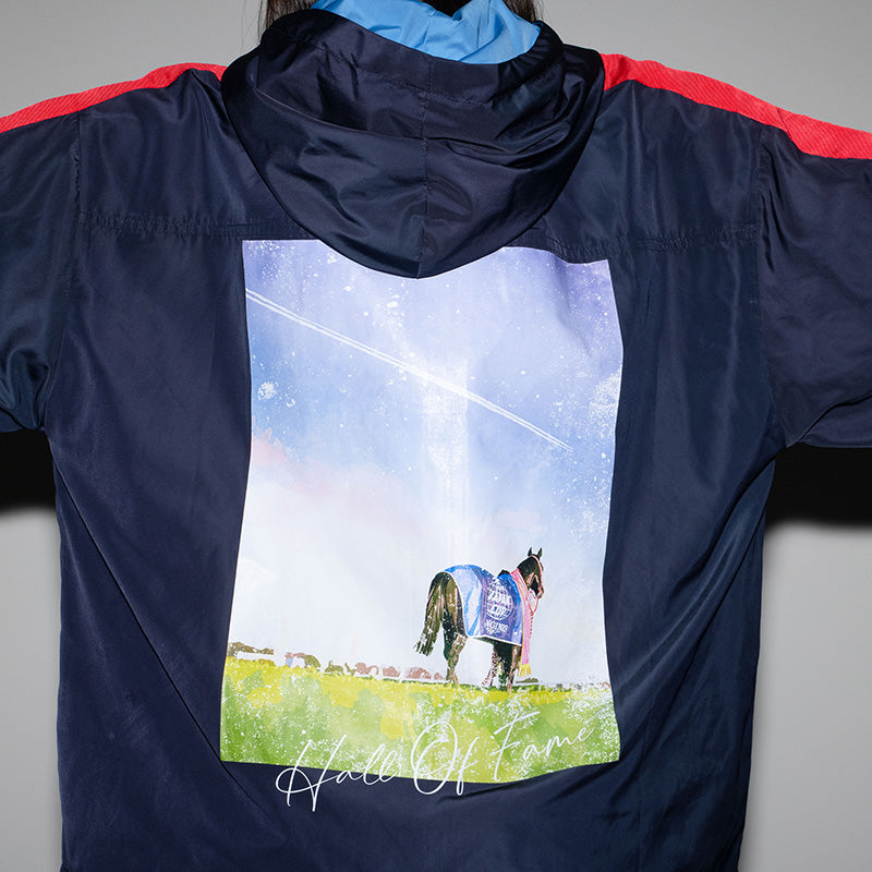 ラストランとなったジャパンカップの優勝風景をモチーフにしたオリジナルイラストが特徴のブルゾンです。 黒地がベースながら勝負服の配色がポイントで、表面はトリプルクラウンが飾られた馬名が左胸にデザインされております