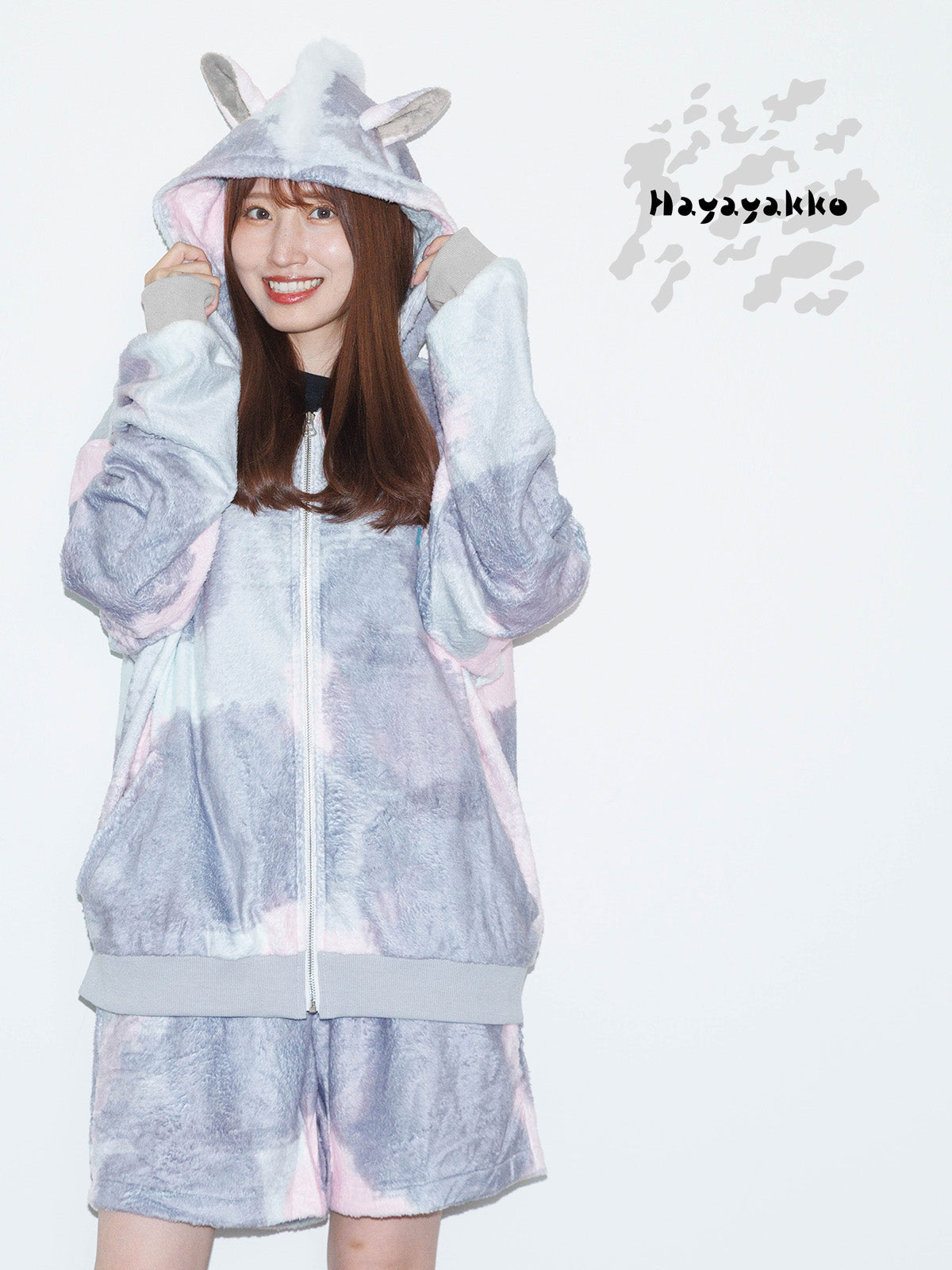 ふわふわの立髪デザインがポイントのパーカーと、ショートパンツのセットアップ仕様。