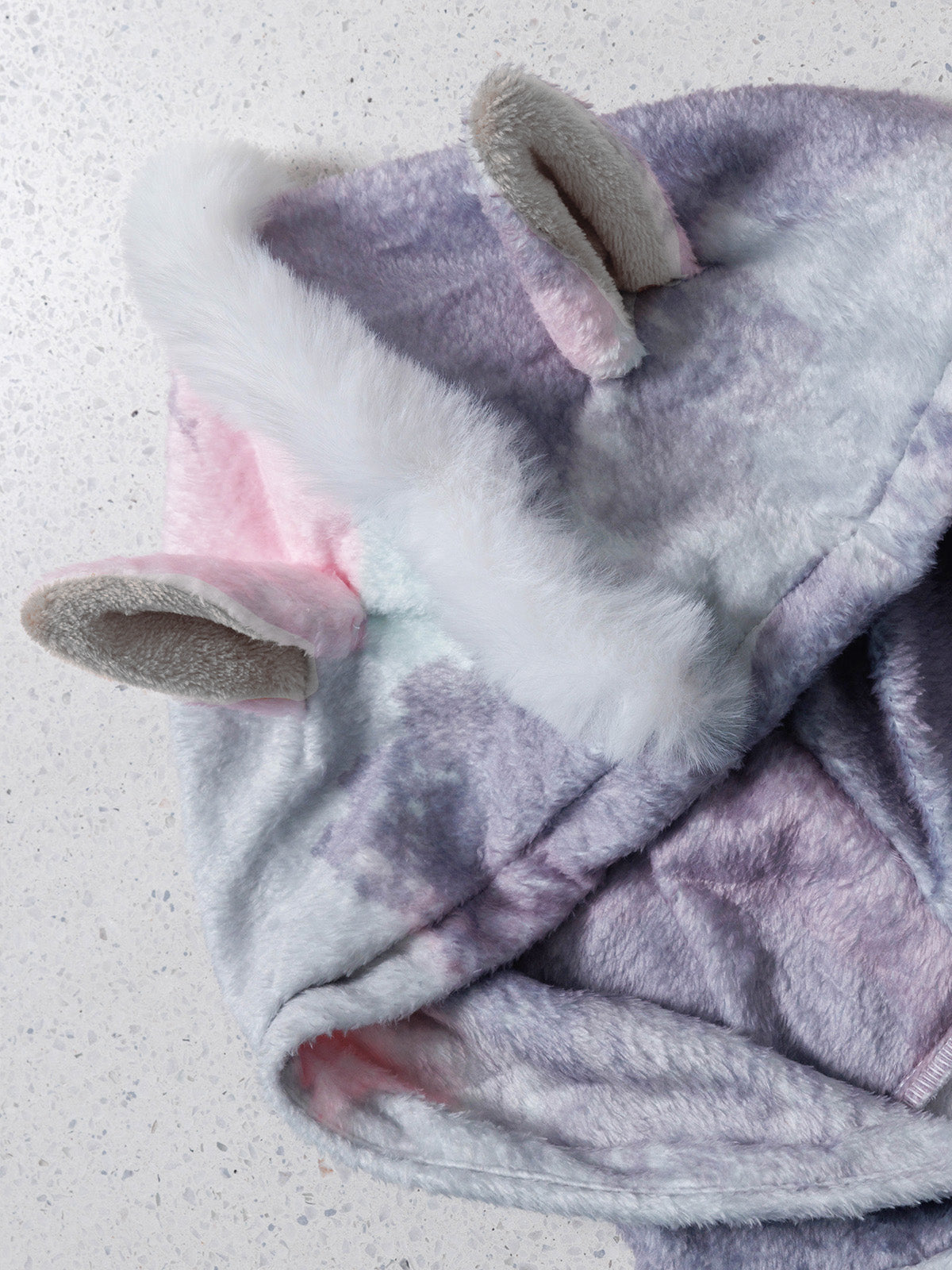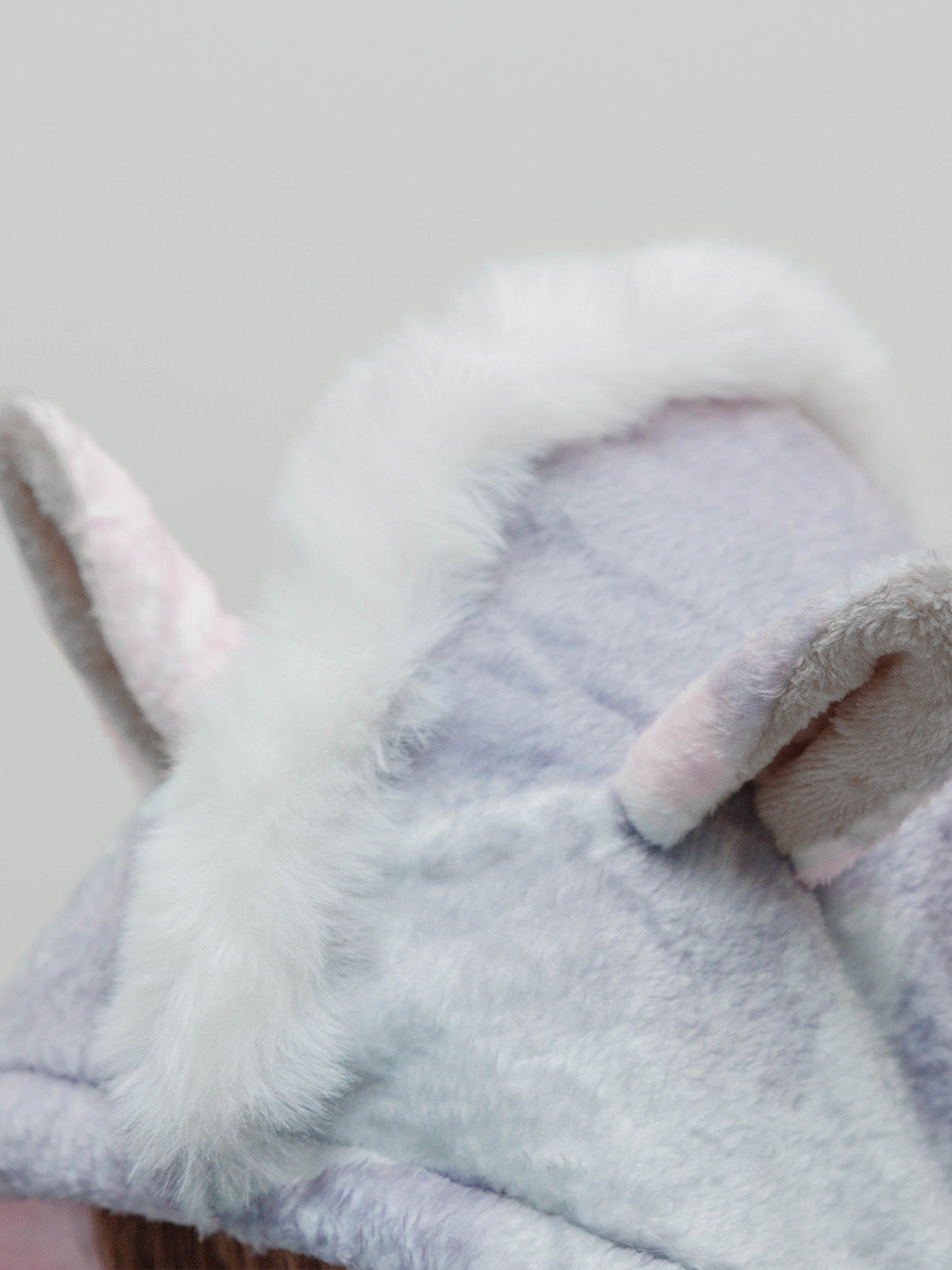 ピンクやグレーのまだら模様を再現したふわもこ素材が、まるで彼の白毛を思わせるやさしい印象に。