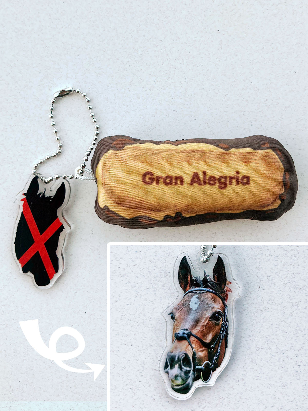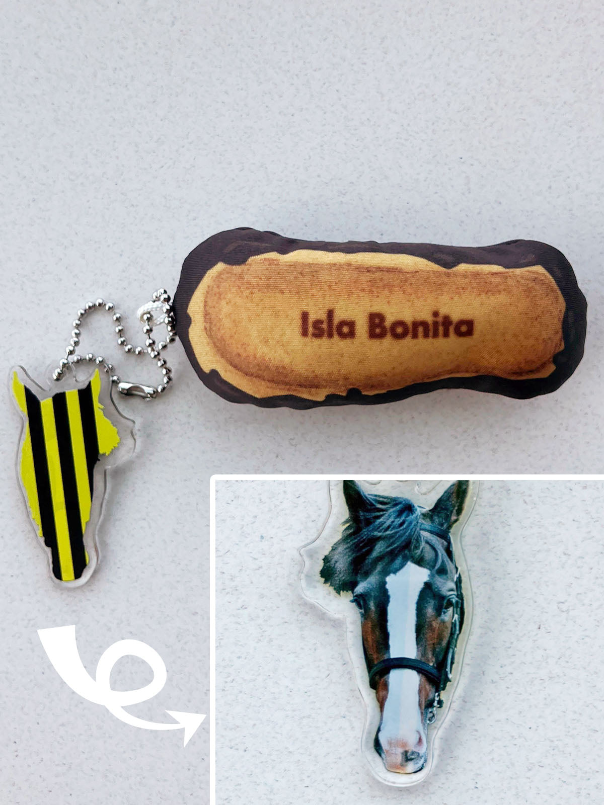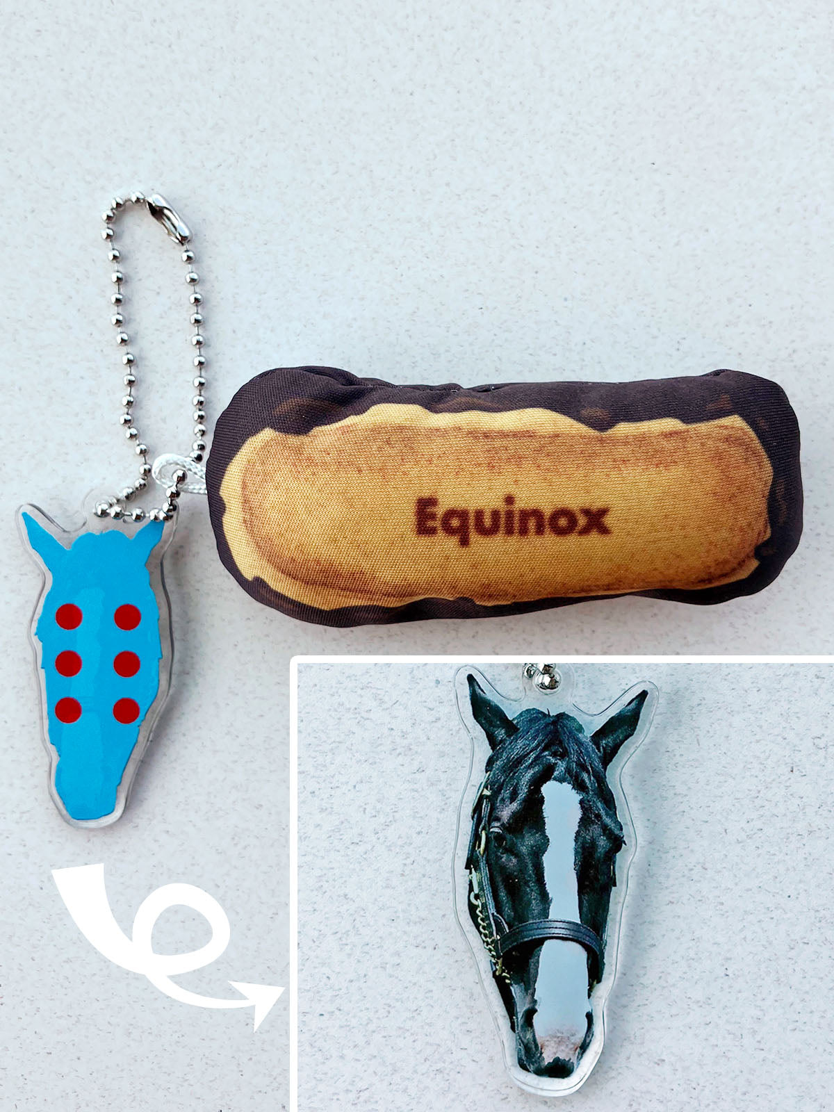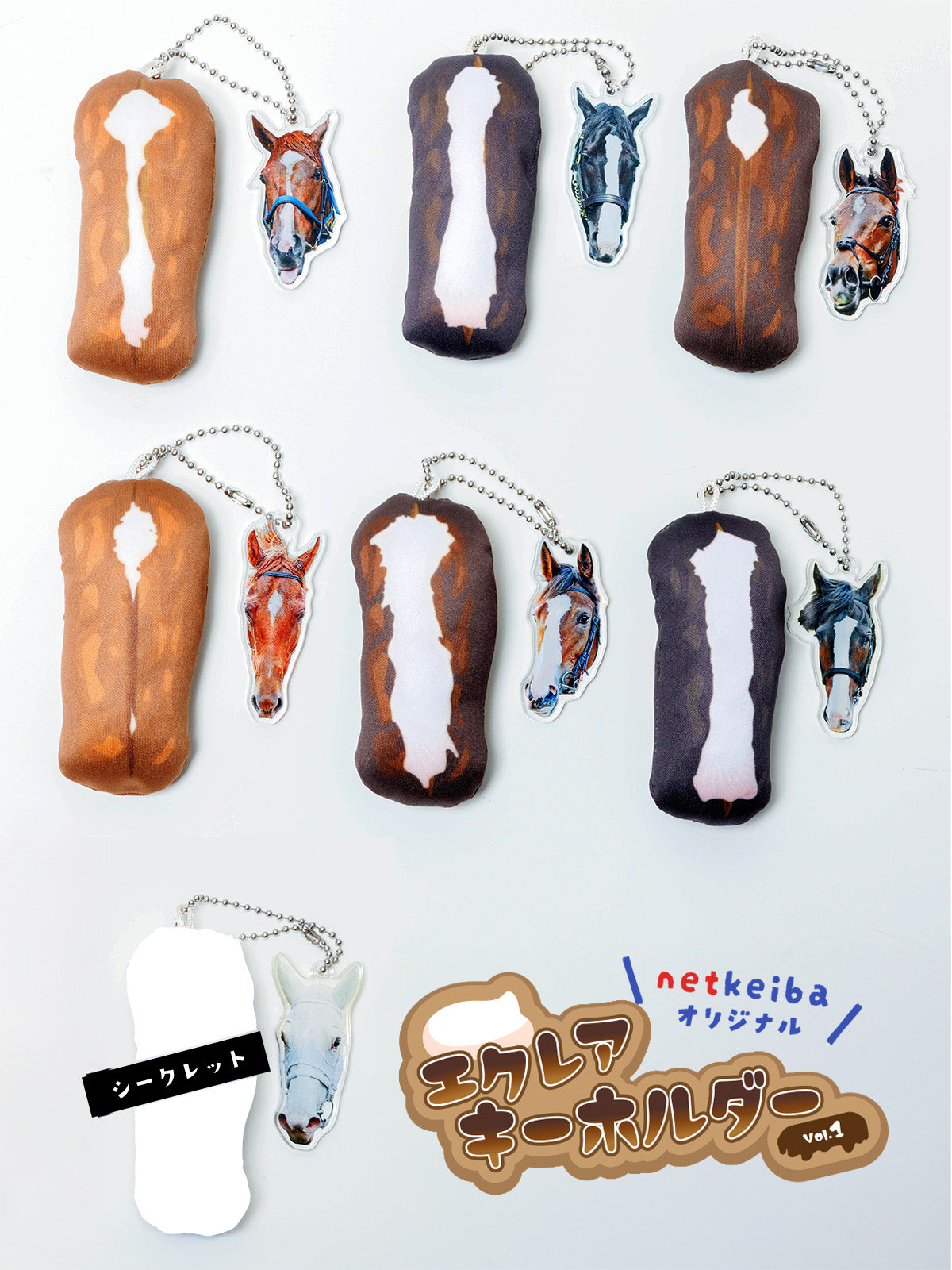 競走馬の個性である白斑がエクレア型のキーホルダーに!? 競走馬の新たな一面をグッズで楽しむことができる商品です。