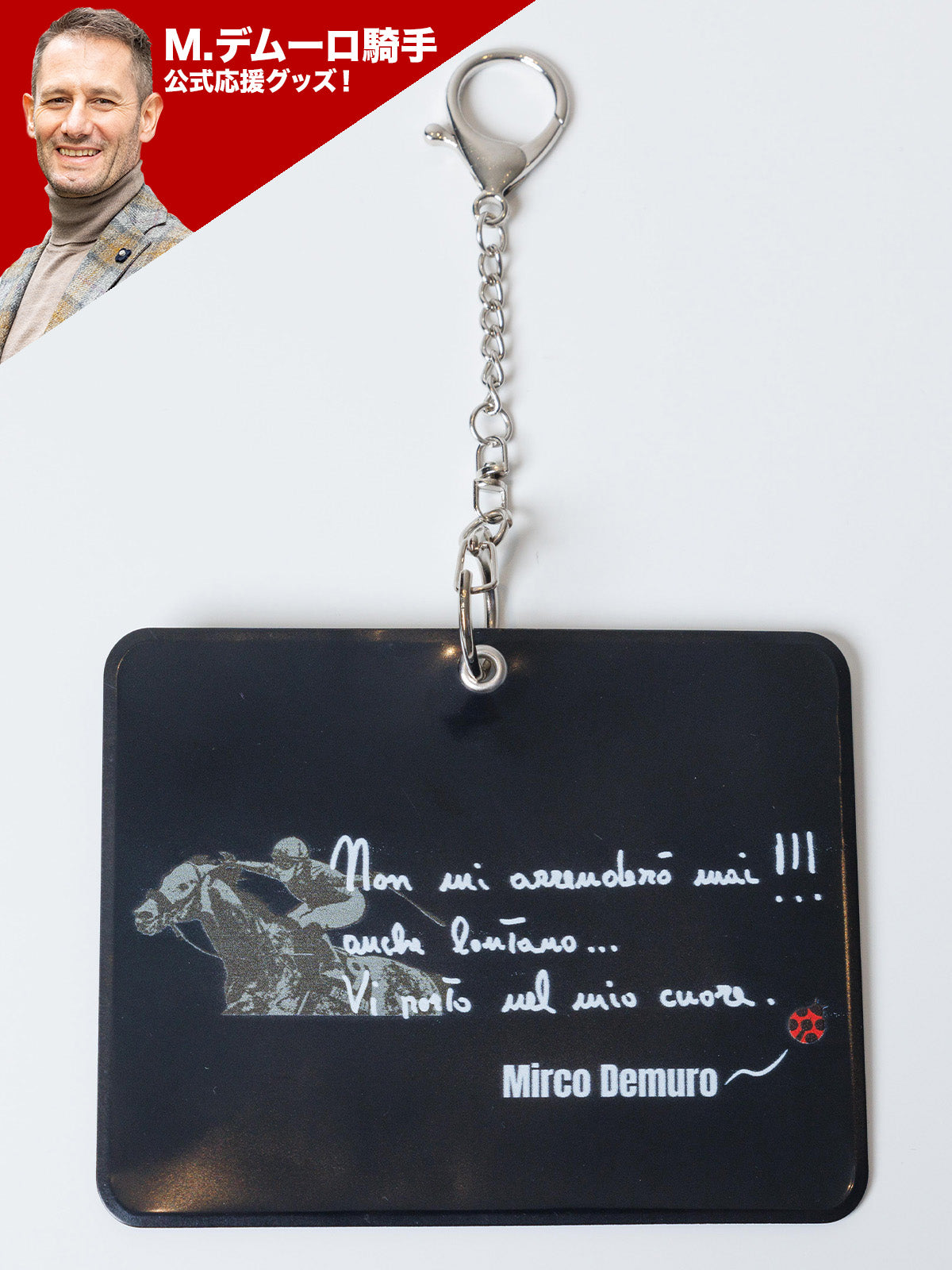 幸運のシンボルとしてミルコ騎手が大切にしてきたてんとう虫と本人直筆のイタリア語メッセージ「Non mi scorderò mai!!! Anche lontano… Vi porto nel mio cuore.」をデザインしたオリジナルパスケースです。