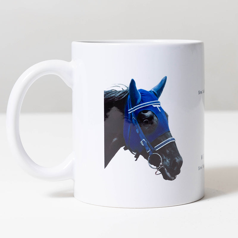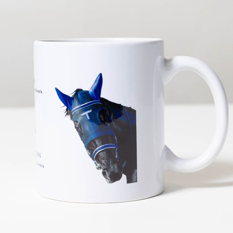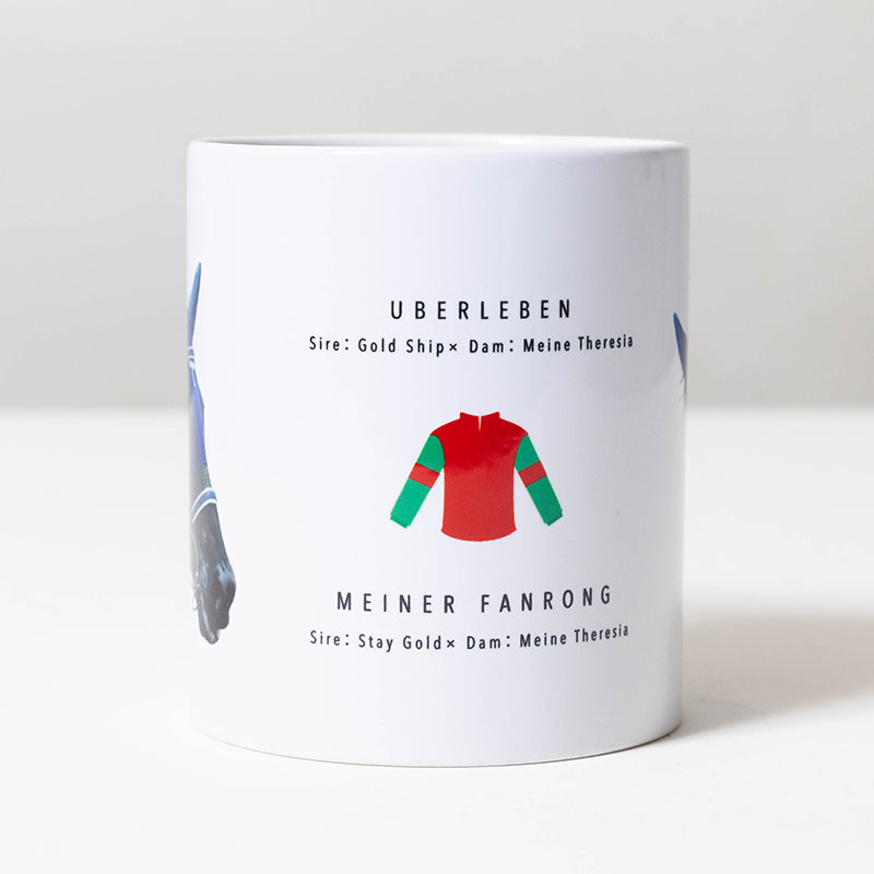 マイネルファンロンさんとユーバーレーベンさんのお顔が両面にプリントされたマグカップです。毛色も同じな兄妹カップを普段使いでご活用ください。