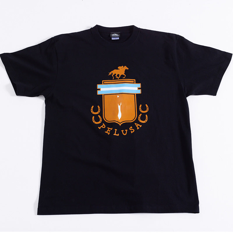 その底知れぬ能力と個性あふれる走りで多くの競馬ファンを魅了した「ペルーサ」のオリジナルTシャツ(黒)です。