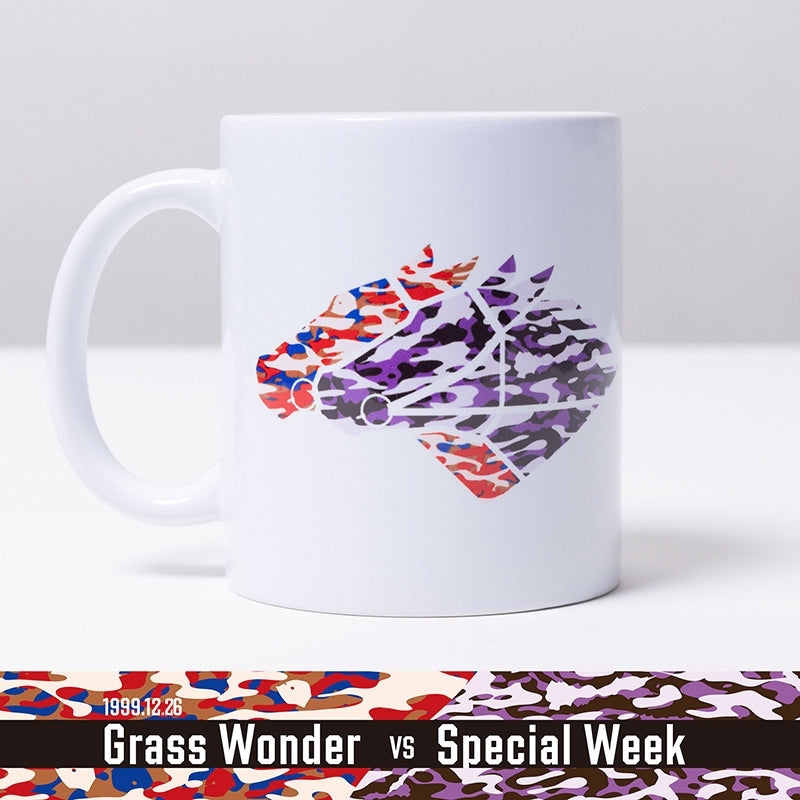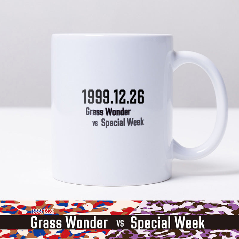 1999年12月26日の有馬記念、歴史的名勝負と語り継がれるグラスワンダー号とスペシャルウィーク号の名勝負を迷彩柄でデザインしたマグカップです。